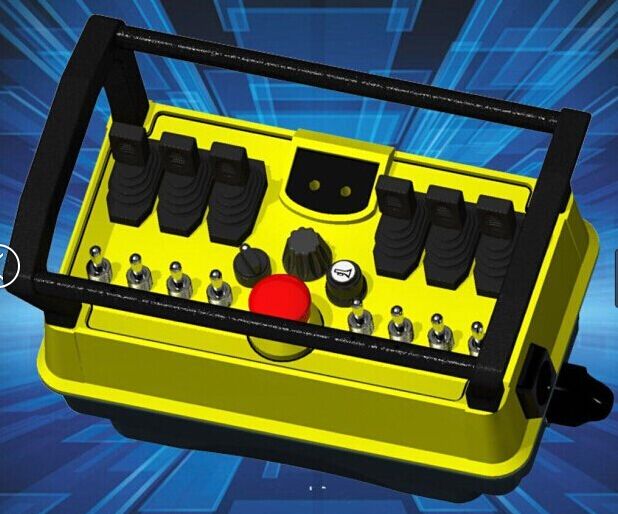 8、 针对重型重工设备,可定制多个比例杆+多个拨杆或按键组合方式控制,或多个摇杆组合式控制方式,如6比例杆+8拨杆控制非标工业遥控器定制,三摇杆工业遥控器定制等,以适应大型重工设备多机构多角度多方向多速度的协同或单独控制的操作可能。并设置欧规急停蘑菇头旋钮,确保在紧急情况下,能够瞬间切断被控端总电源及遥控器系统关机,保障瞬间紧急停止设备动作,以确保人身生命安全及设备安全。