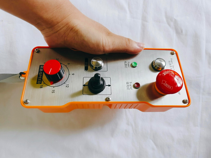 控制设备正反转且可以进行无级调速控制。控制过程,为确保操作的安全性,可起用使能功能,即为只有在一边按压“使能”按键的情况下,才可执行执行其他动作。另有遥控器本身的启动+急停旋钮。急停对应2路继电器输出含1路常开点(常用)+1路常闭点(备用)。 本机可实现2路开关量控制,1路模拟量0-10V无级调速。 |