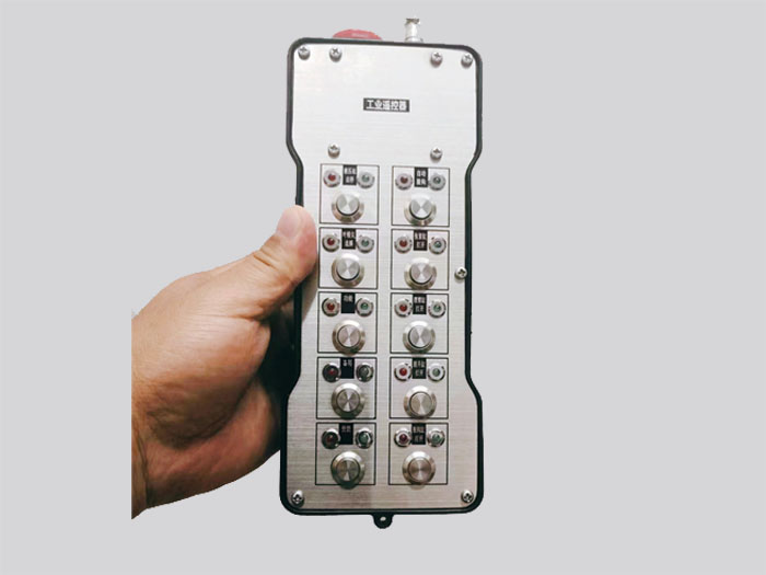 4)启动+急停蘑菇头旋钮,启动布局为旋转开关或自锁式按键,急停为欧规急停蘑菇头式,自锁保持模式,对应2路继电器输出。启动即为启动发射器本身电源开关,同时对应接收器端输出控制回路的接通,此时被控端设备通电,急停拍下,则可瞬间切断所有输出。发射器端的启动按钮关闭,发射器端电源关掉,且5秒钟后,接收器端亦可自我急停,保障安全!
