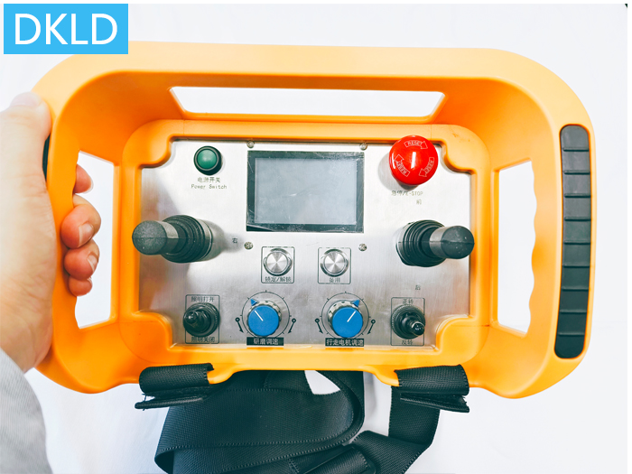 如果发射器端布局为1个万向无极摇杆,设计前后左右4个方向推动控制,及4个方向的夹角控制输出,用于底盘的前后左右任意方向行走控制,前后方向下压要干的幅度越大则速度越快,幅度越小则速度越慢。摇杆Y轴方向推动控制时,首先对应开关量控制输出,继续推动再执行开关量控制方向的调速0-10V模拟量输出控制。研磨正反转输出,布局为1个三位自锁保持模式扭子开关即拨杆,及1个调速旋钮,“锁定/解锁”按钮1个,还有启动+急停按键,产品定制型号DH-Z1YB3S1M(DC24V/100米/0-10V/1发1收)其他电压通过增配外置变压器转压适配!